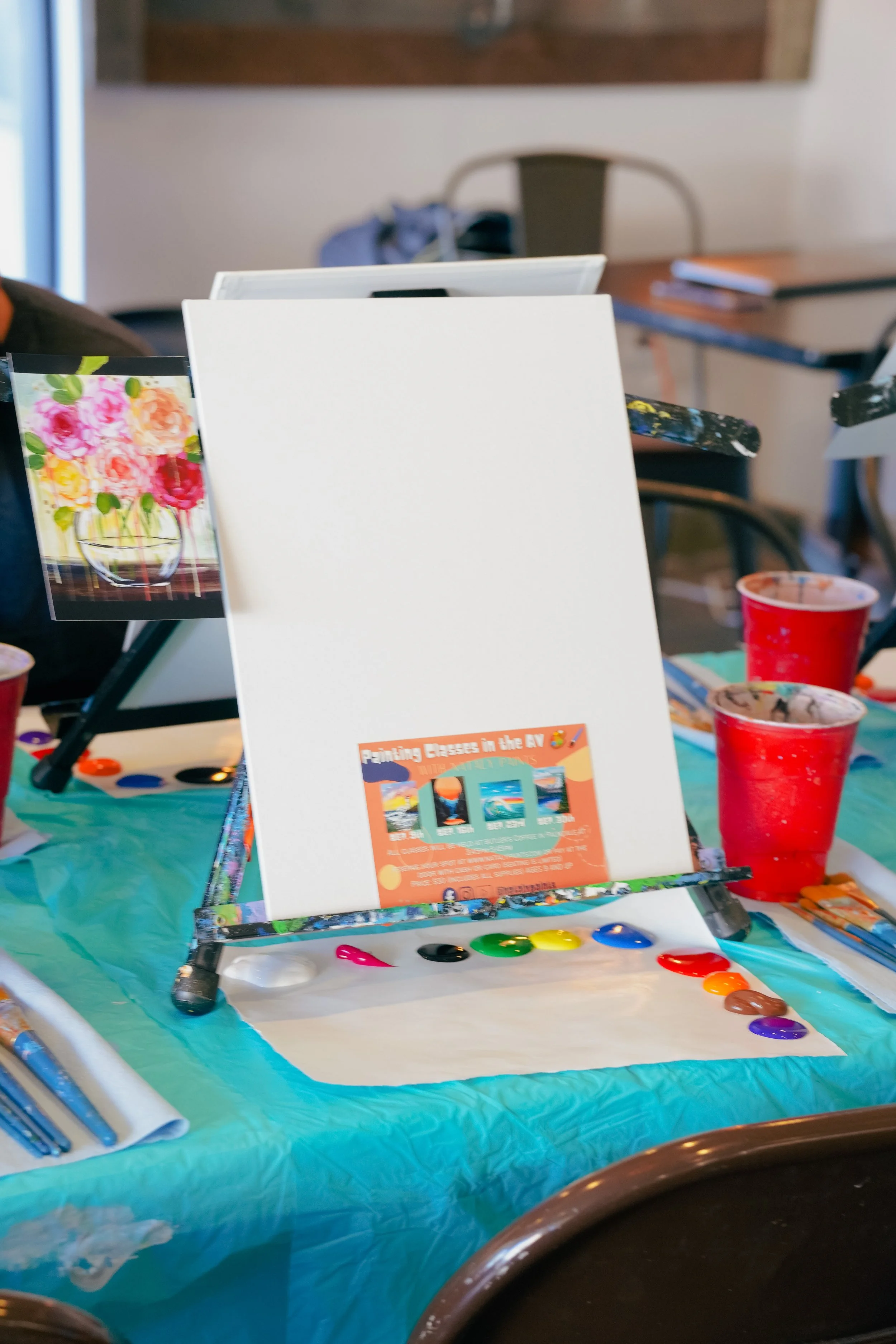Includes: canvas, an easel, palette paper, paint, paint brushes, water cup, shop towel, aprons, reference photo and step by step instruction. Ages 9 and up.
