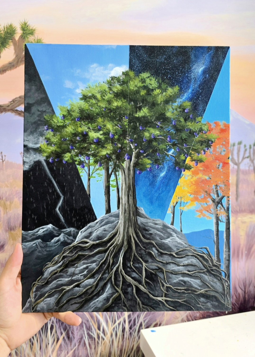 I found myself in a place where all I was doing was work. When I pumped the breaks and took some time to paint. Here's a quote I'll never forget, "Once you learn you how to paint, what becomes hard is what to paint" - Bob Ross. I sat down and searched through my photos on my phone, I'm so drawn to landscapes so, this painting was based on a photo I took while hiking in the Los Angeles Forest. I didn't realize how much I needed that, fresh air.